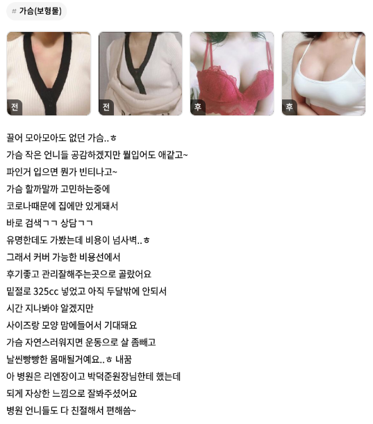 리엔장성형외과의원 ★★★★★ 5.0 [강남언니] 가슴성형/ 2개월차/ 닉네임:치즈마니 익***@ | 2022.01.11 | 18 리엔장성형외과에서 수술 받은 후 강남언니에 업로드한 실제 후기입니다. 수술항목: 가슴성형(밑절/325cc) 리뷰 목록으로