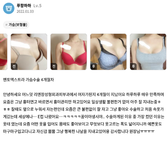 리엔장성형외과의원 ★★★★★ 5.0 [강남언니] 가슴성형(멘토) / 4개월차/ 닉네임:푸항하하 익***@ | 2022.01.11 | 19 리엔장성형외과에서 수술 받은 후 강남언니에 업로드한 실제 후기입니다. 수술항목: 가슴성형(멘토엑스트라) 리뷰 목록으로