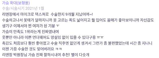 리엔장성형외과의원 ★★★★★ 5.0 [강남언니] 가슴성형(세빈마텍) / 9개월차/ 닉네임:코손실와용 익***@ | 2022.01.11 | 20 리엔장성형외과에서 수술 받은 후 강남언니에 업로드한 실제 후기입니다. 수술항목: 가슴성형(세빈서브리미티 / 왼 395cc 오 365cc) 리뷰 목록으로