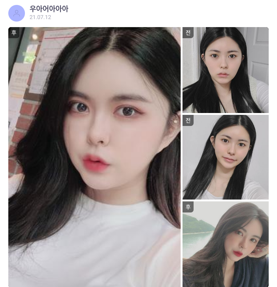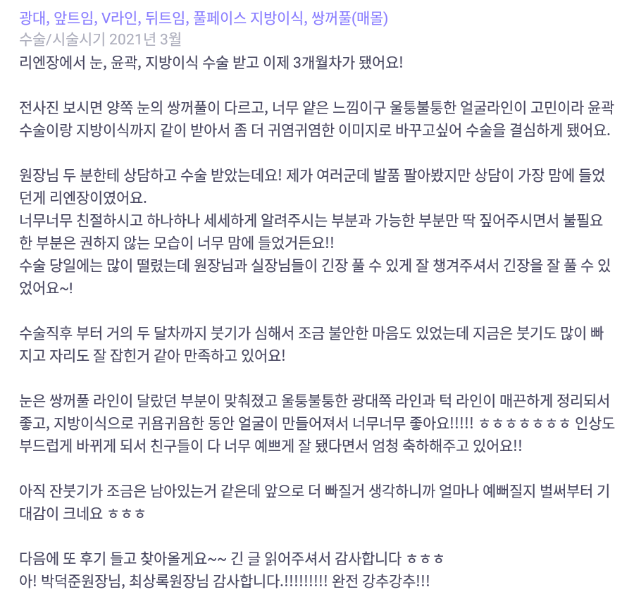 리엔장성형외과의원 ★★★★★ 5.0 [바비톡] 지방이식, 안면윤곽, 쌍꺼풀 / 3개월차/ 닉네임:우아어아아아 익***@ | 2022.01.11 | 17 리엔장성형외과에서 수술 받은 후 강남언니에 업로드한 실제 후기입니다. 수술항목: 윤곽 3종, 쌍꺼풀(매몰), 풀페이스 지방이식 리뷰 목록으로