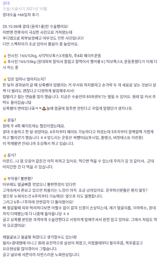리엔장성형외과의원 ★★★★★ 5.0 [바비톡] 안면윤곽 / 2개월차/ 닉네임: 치이이이킨 익***@ | 2022.01.18 | 21 리엔장성형외과에서 수술 받은 후 바비톡에 업로드한 실제 후기입니다. 수술항목: 광대축소 리뷰 목록으로