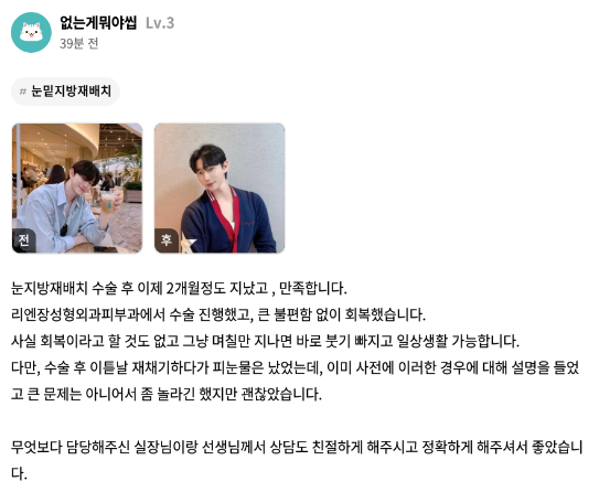 리엔장성형외과의원 ★★★★★ 5.0 [강남언니] 눈지재 / 1개월차 / 닉네임 : 없는게뭐야씹 익***@ | 2022.03.08 | 25 리뷰 목록으로