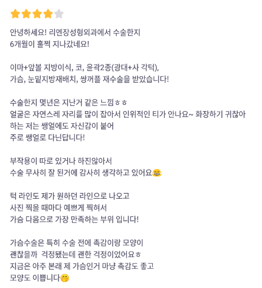 리엔장성형외과의원 ★★★★★ 5.0 [바비톡 후기] 눈재수술,코,가슴(모티바),지방이식(이마앞광대),윤곽2종 / 6개월차 / 닉네임:듀듀듀쥬쥬 익***@ | 2024.03.07 | 18 리뷰 목록으로
