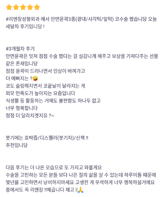 리엔장성형외과의원 ★★★★★ 5.0 [바비톡] 코성형, 윤곽3종(광대사각턱앞턱) / 3개월차 / 닉네임 : 박땐땐 익***@ | 2024.03.12 | 28 리뷰 목록으로