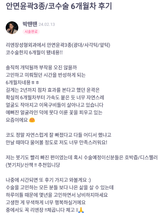 리엔장성형외과의원 ★★★★★ 5.0 [바비톡] 윤곽3종, 코성형 / 6개월차 / 닉네임: 박땐땐 익***@ | 2024.08.29 | 17 [바비톡] 윤곽3종, 코성형 / 6개월차 / 닉네임: 박땐땐 리뷰 목록으로